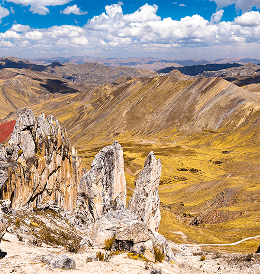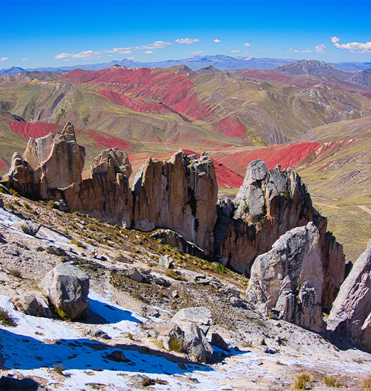 When we arrive at the start of the trail, we'll take a short, easy 1.5 kilometer hike up to the stunning Palccoyo Rainbow Mountain, which is 4,700 meters (15,500 feet!) above sea level. While the more well-known Vinicunca can get crowded with over 500 visitors, Palccoyo usually has around 50 visitors a day, giving us a chance to enjoy its beauty in peace. If we are up for a bit more adventure, there's a quick side path to a small stone forest. This spot offers even more incredible views of Palccoyo and the area around it.