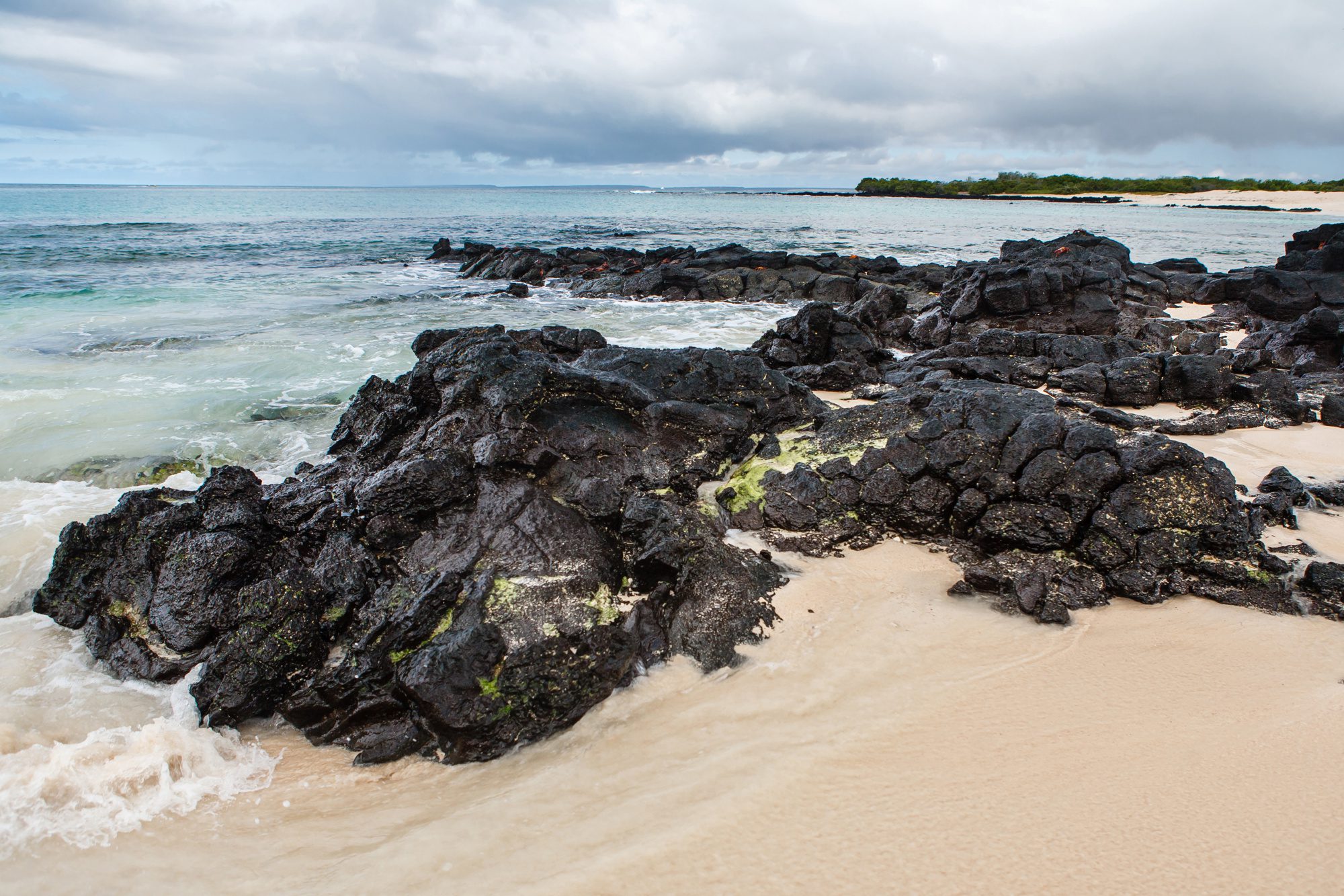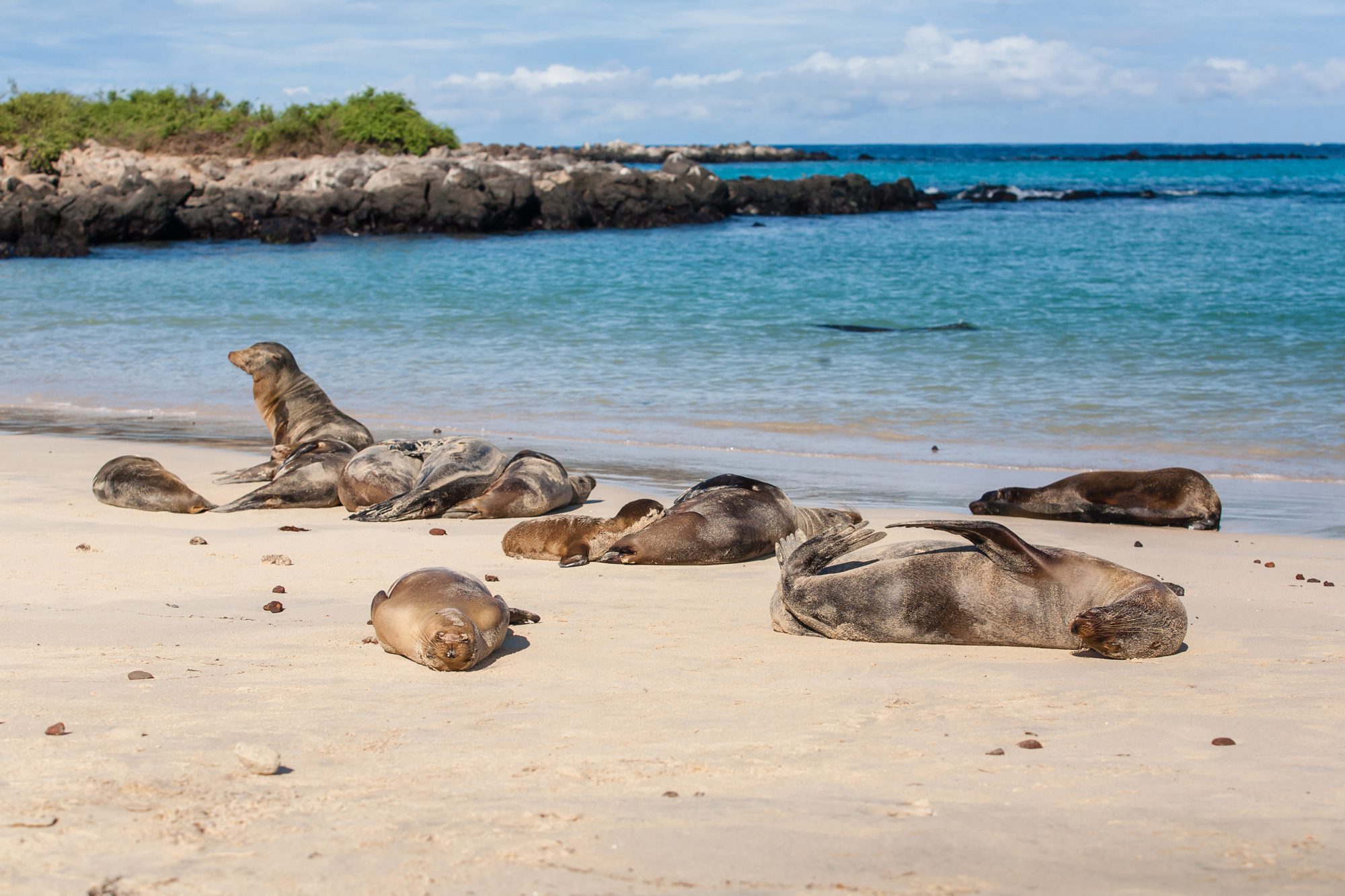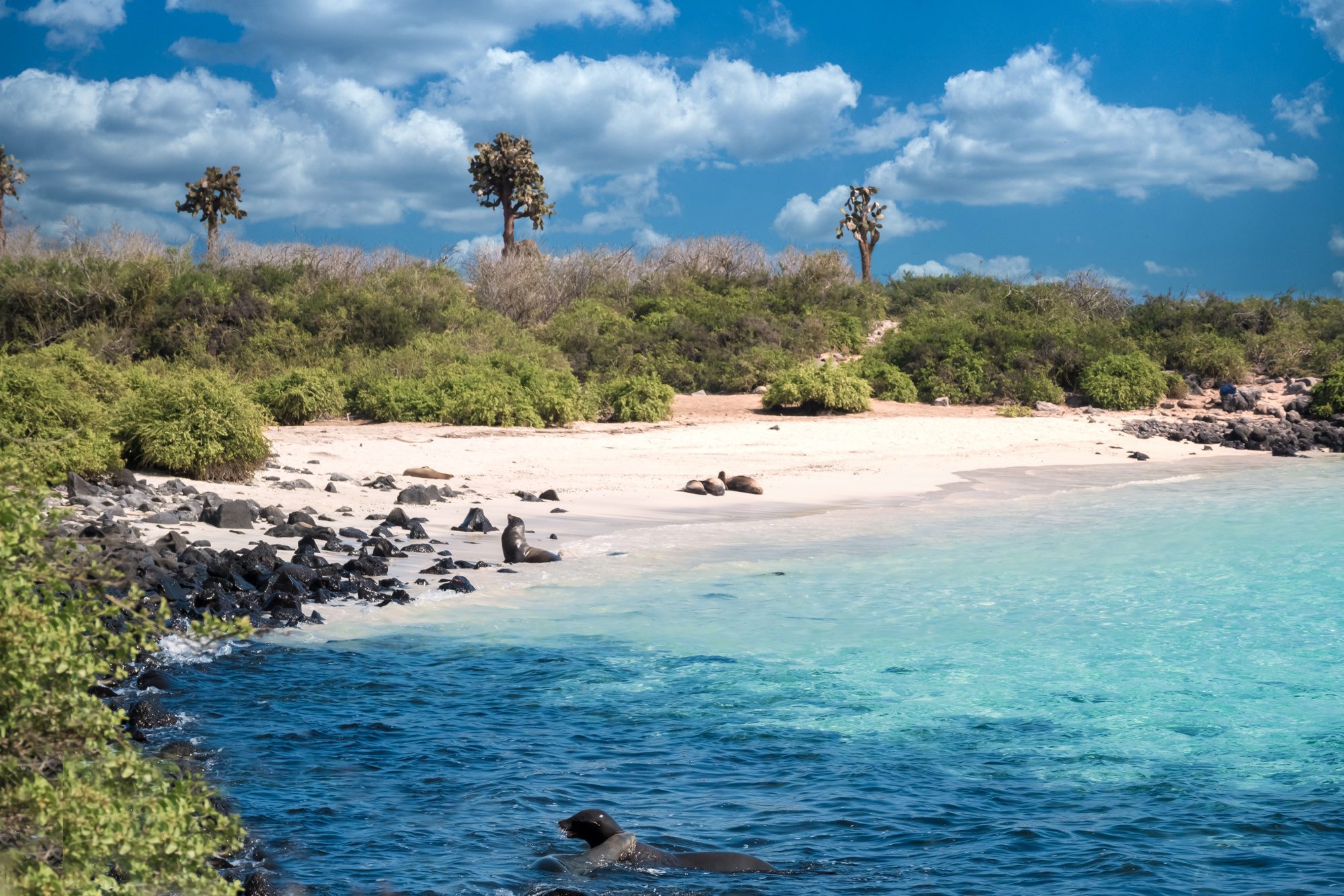 After lunch, our first stop is Bachas Beach, known for its soft, white sand made of decomposed coral. This beach is also a popular nesting site for sea turtles. Nearby, we'll find a small lagoon where we can observe flamingos, black-necked stilts, thrushes, and the remains of two abandoned barges from the 1940s. Sea lions, marine iguanas, and seabirds rest on the beach, and we may even have the chance to swim with the playful sea lions.